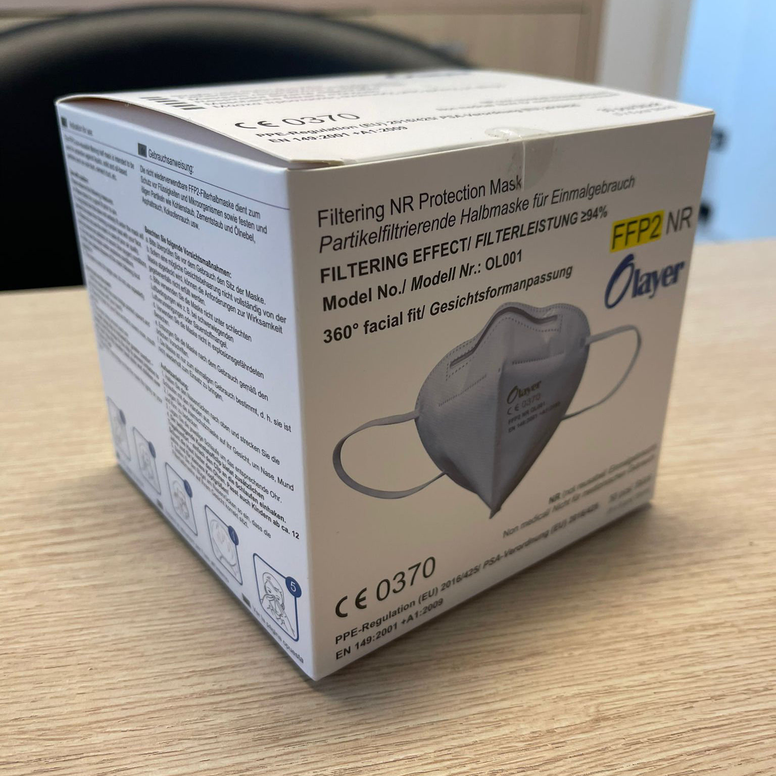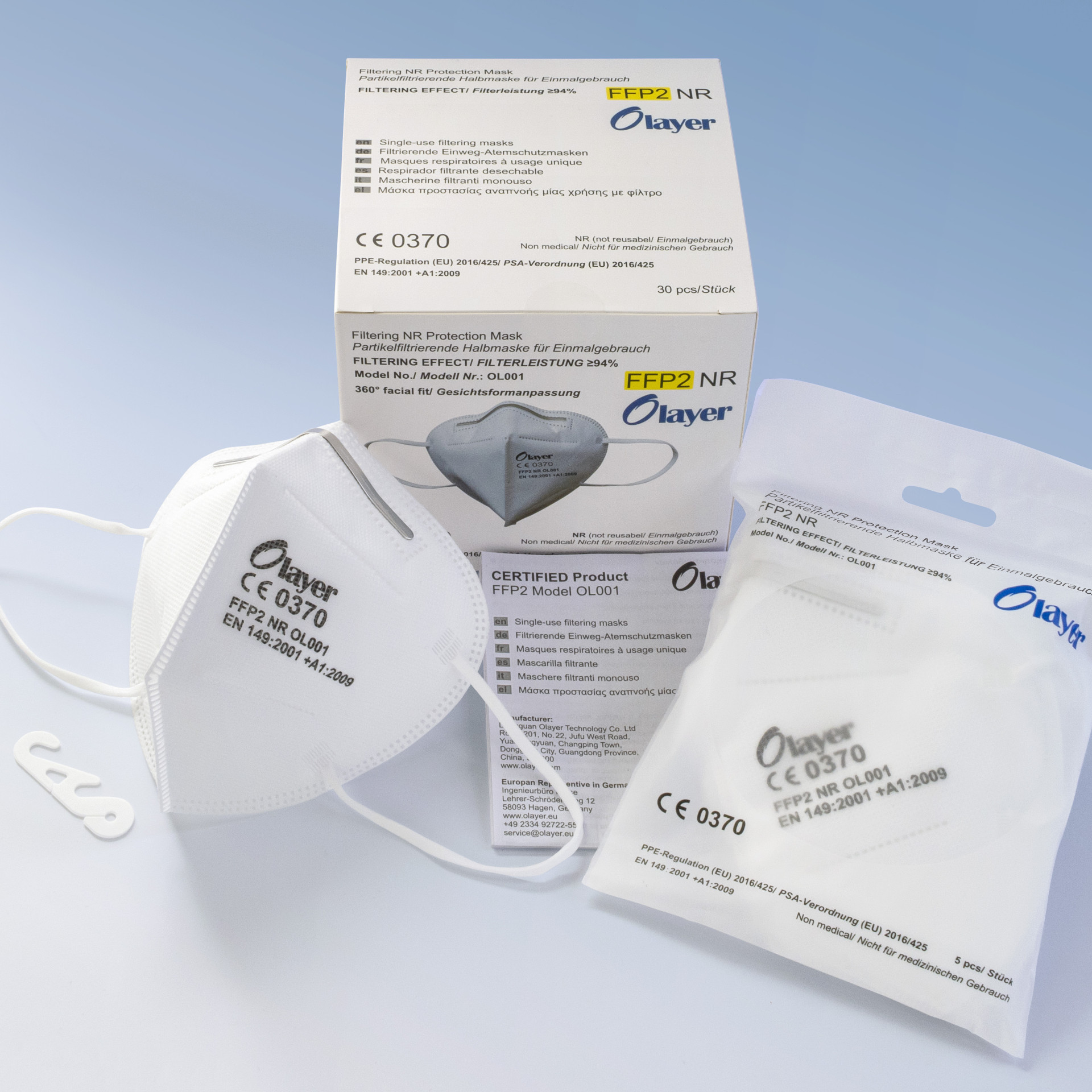 Le mascherine FFP2 modello “Olayer OL001” sono confezionate in scatole da 30 pezzi (5 bustine richiudibili con 6 mascherine FFP2), ogni cartone master contiene 48 scatole (per un totale di 1440 pezzi).